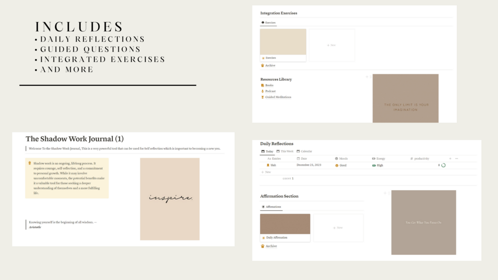 Embark on a journey of self-discovery and personal growth with The Shadow Work Notion Template. This tool is designed to guide you through a holistic exploration of your inner world, helping you uncover hidden aspects of yourself and fostering a deeper connection with your authentic being. so you can become the most irresistible person in any space you walk into.